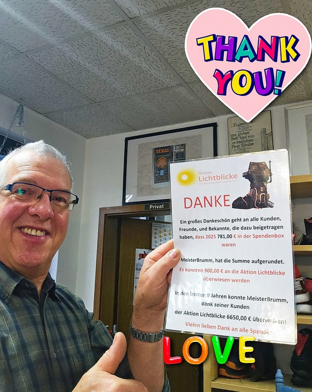 Auch 2025 konnten, dank Trinkgelder wieder 900,00 €, an die AKTION LICHTBLICKE überwiesen werden . MeisterBrumm sagt DANKE!